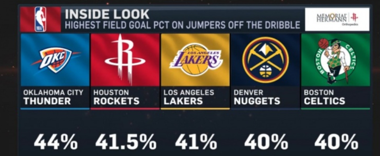 3月21日讯 今天,知名美媒晒出本赛季NBA球队运球后跳投命中率排行榜前五名,这份榜单直观展现了各支强队在持球进攻端的投射效率,其中俄克拉荷马城雷霆以绝对优势位居榜首,休斯顿火箭、洛杉矶湖人紧随其后,丹佛掘金与波士顿凯尔特人并列第四,五支球队的命中率均达到40%及以上,展现出极强的持球投射能力。